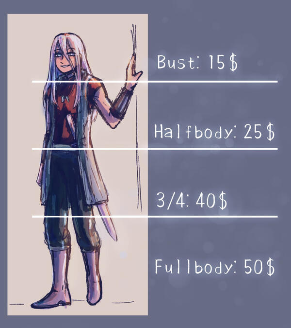 (15$ for bust + 7.50$ for additional char)3 halfbody & detailed bg: 65$